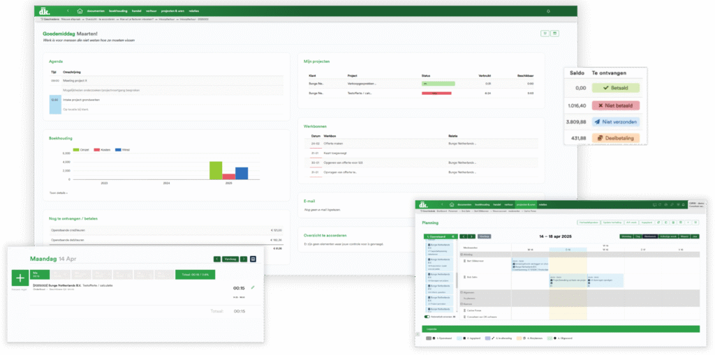 DK Groen bevat álle modules die jij nodig hebt in de groen, grond of infra sector voor jouw bedrijfsproces. Je hebt géén apart pakket meer nodig voor je boekhouding, calculaties, urenregistratie en werkbonnen. Hiermee creëer je rust en overzicht in je bedrijf. Het tijdperk van handmatig meerdere softwaresystemen bijhouden is voorbij. Wij hebben koppelingen met Office 365, Google Mail en Agenda en iCloud. Voortaan kun je vanuit 1 pakket je gehele bedrijfsvoering doen.